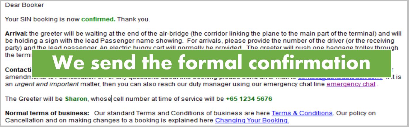 When we confirm your booking we will normally send the local airport supervisor’s duty number, to call just in case there is a problem at the time of service. For example you cannot see your greeter, or you are going to reach the airport a bit later than planned becase of traffic.